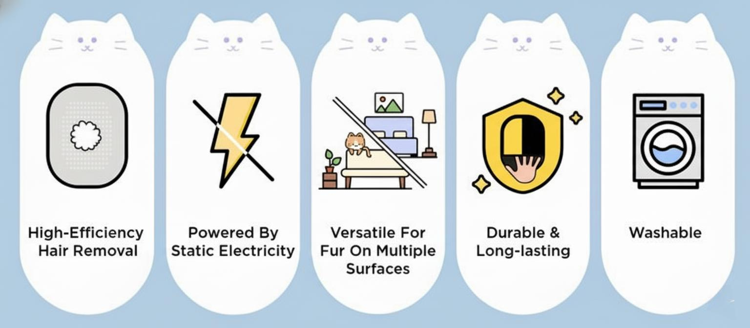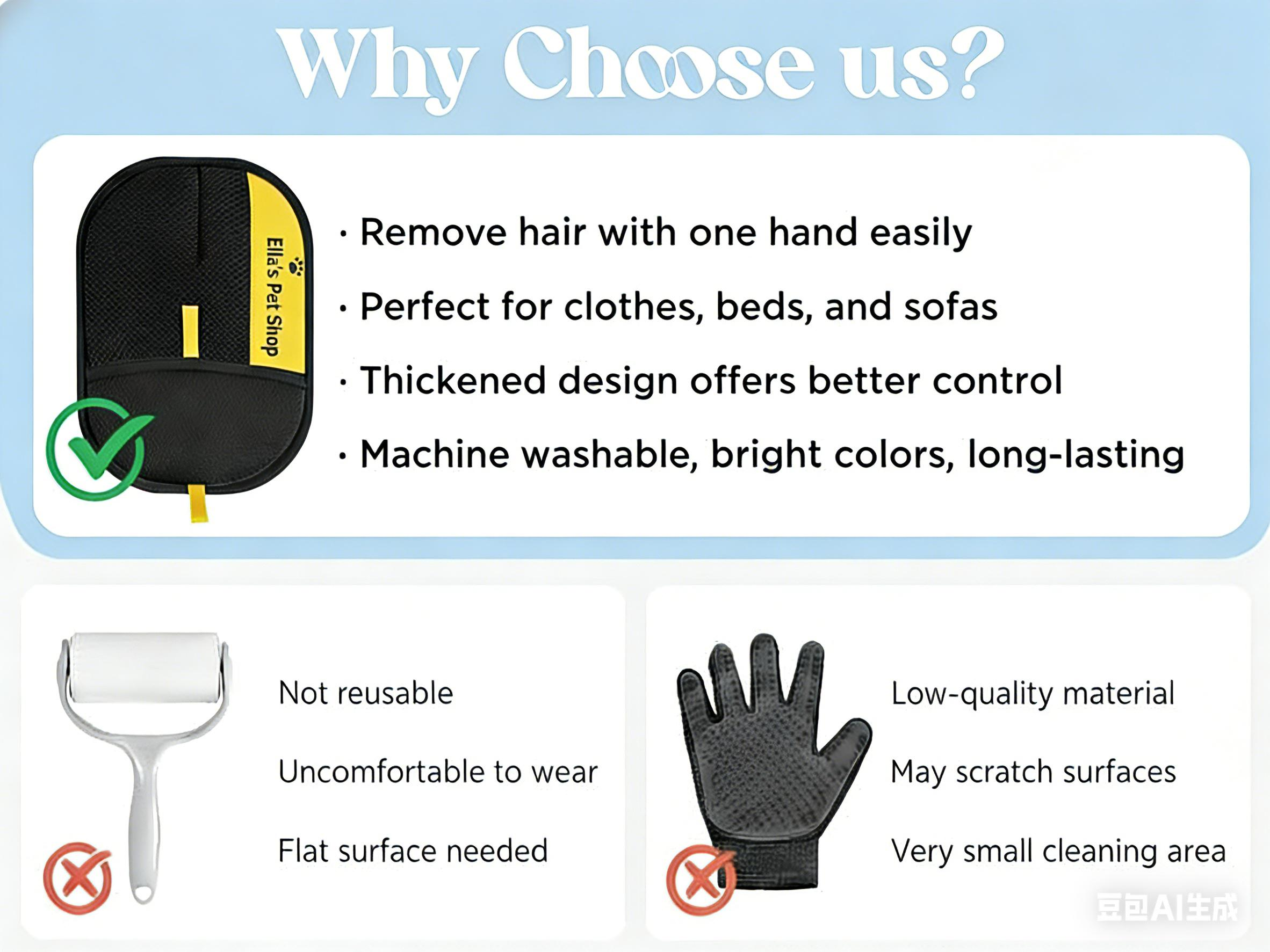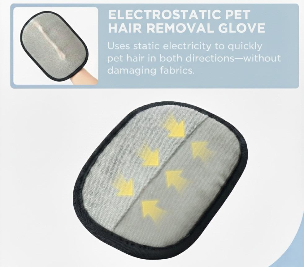 Say goodbye to sticky lint rollers! Our Pet Hair Removal Glove uses static electricity and a unique design to effortlessly collect pet fur. It's easy to use and highly effective at removing pet hair from clothes, furniture, and more. Say hello to hassle-free grooming! 🐾